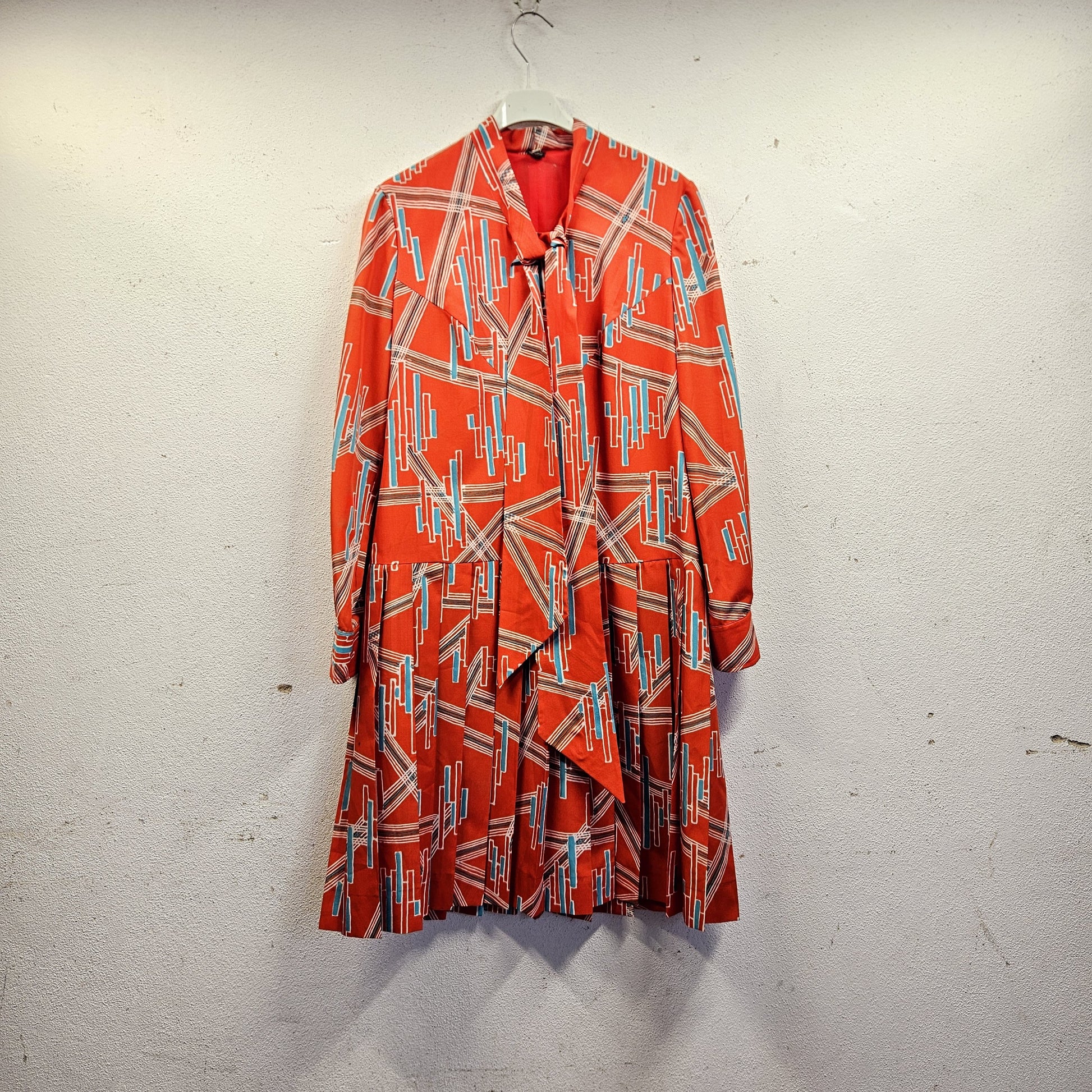 Abito vintage anni '70/'80 in tessuto sintetico leggero caratterizzato da una vivace stampa geometrica e astratta su base arancio. Il modello presenta un elegante collo con nastro da annodare e chiusura a bottoni. Le maniche sono lunghe con polsino. Presenta un corpetto, foderato, sagomato con un taglio orizzontale all'altezza della vita bassa, da cui scende una gonna a pieghe. Il taglio è strutturato con vestibilità taglia 46. Perfetto per chi ama lo stile retrò-chic o le geometrie audaci tipiche degli anni '70, da indossare per l'ufficio o per un evento casual-elegante di mezza stagione.