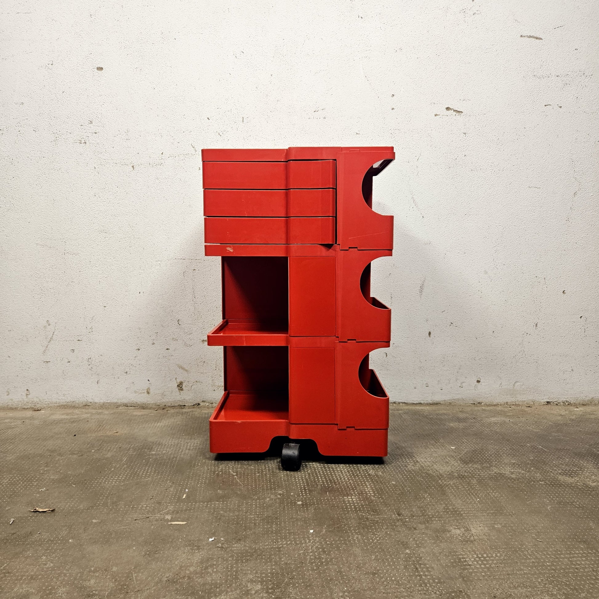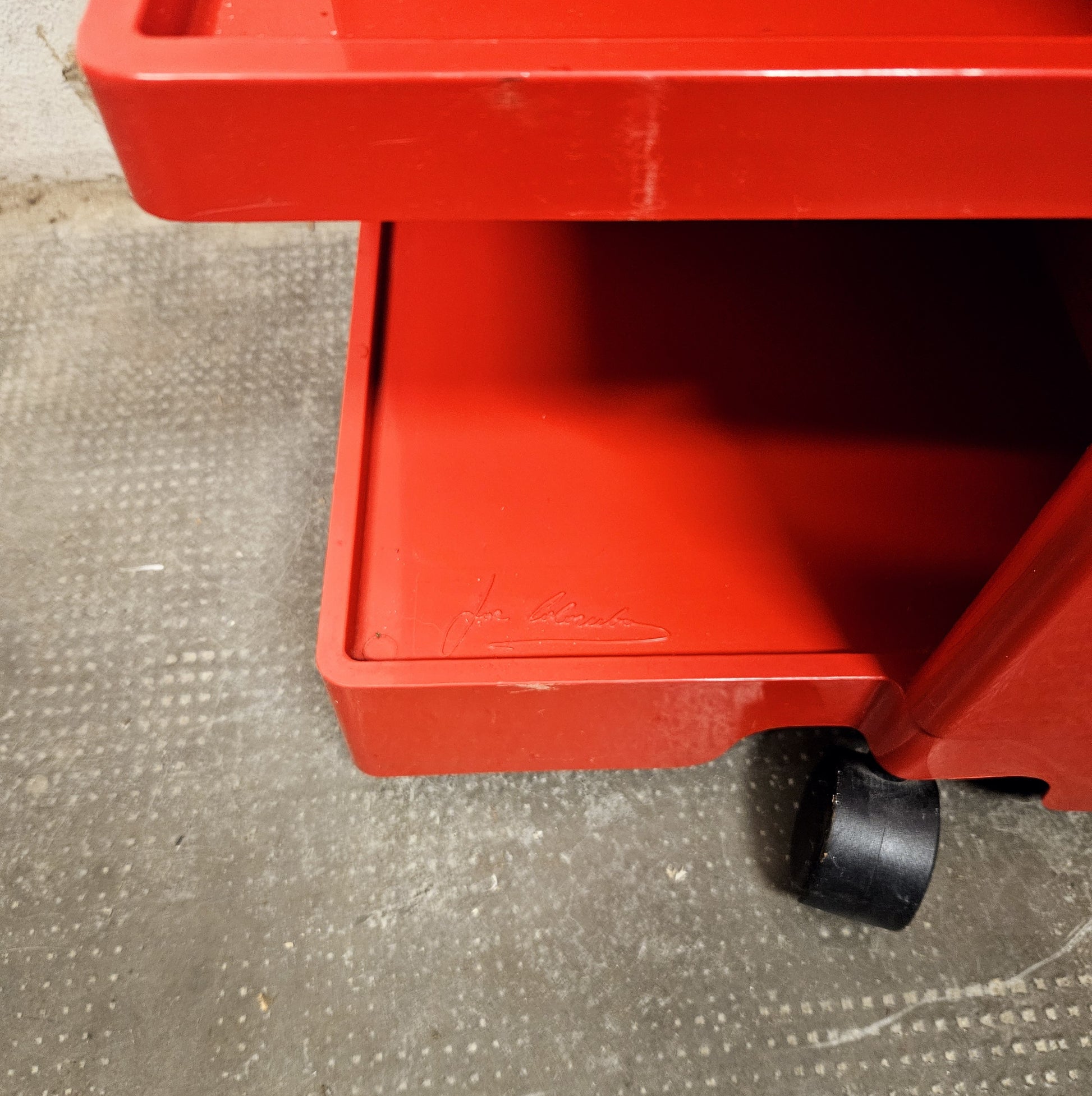Iconico carrello porta-oggetti modello "Boby" ideato da Joe Colombo e prodotto dalla Bieffeplast dagli anni '70. La struttura è realizzata in plastica ABS di colore rosso acceso con design modulare e impilabile. Il fusto centrale, composto da moduli, sostiene una serie di cassetti a scomparti e vani laterali a giorno, tutti realizzati nello stesso materiale plastico. Un dettaglio identificativo è la firma incisa del designer, Joe Colombo, visibile sul corpo del carrello. Il design compatto e l'ingombro ridotto lo rendono ideale per uffici, studi, laboratori o spazi creativi o come mobile contenitore in spazi ristretti. Un pezzo di design pratico e robusto che si integra perfettamente in contesti contemporanei.