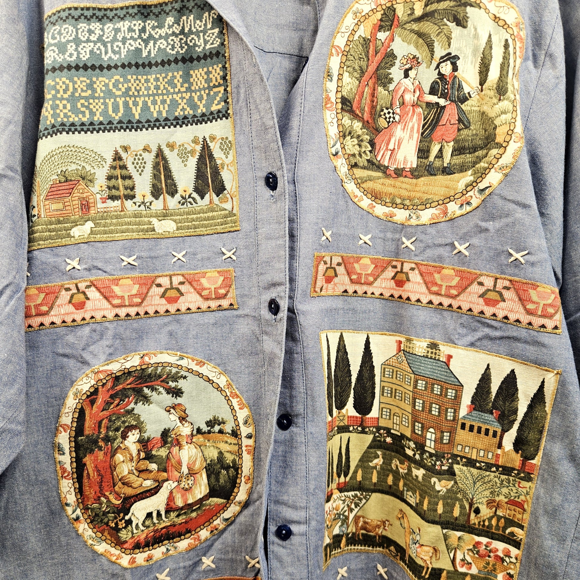 Camicia in morbido cotone di colore azzurro. Il capo è un'esplosione di dettagli, caratterizzato da un ricco patchwork applicato di stampe e ricami in stile tradizionale e bucolico e un carré posteriore a stampa floreale. Il taglio è dritto e leggermente over, con una vestibilità indicativa taglia 40/42, con chiusura a bottoni blu e maniche lunghe Perfetta per chi cerca un look boho-chic, romantico o folk revival in pieno stile anni '80/'90, da abbinare a capi casual come jeans o gonne lunghe per un tocco eccentrico e artigianale.