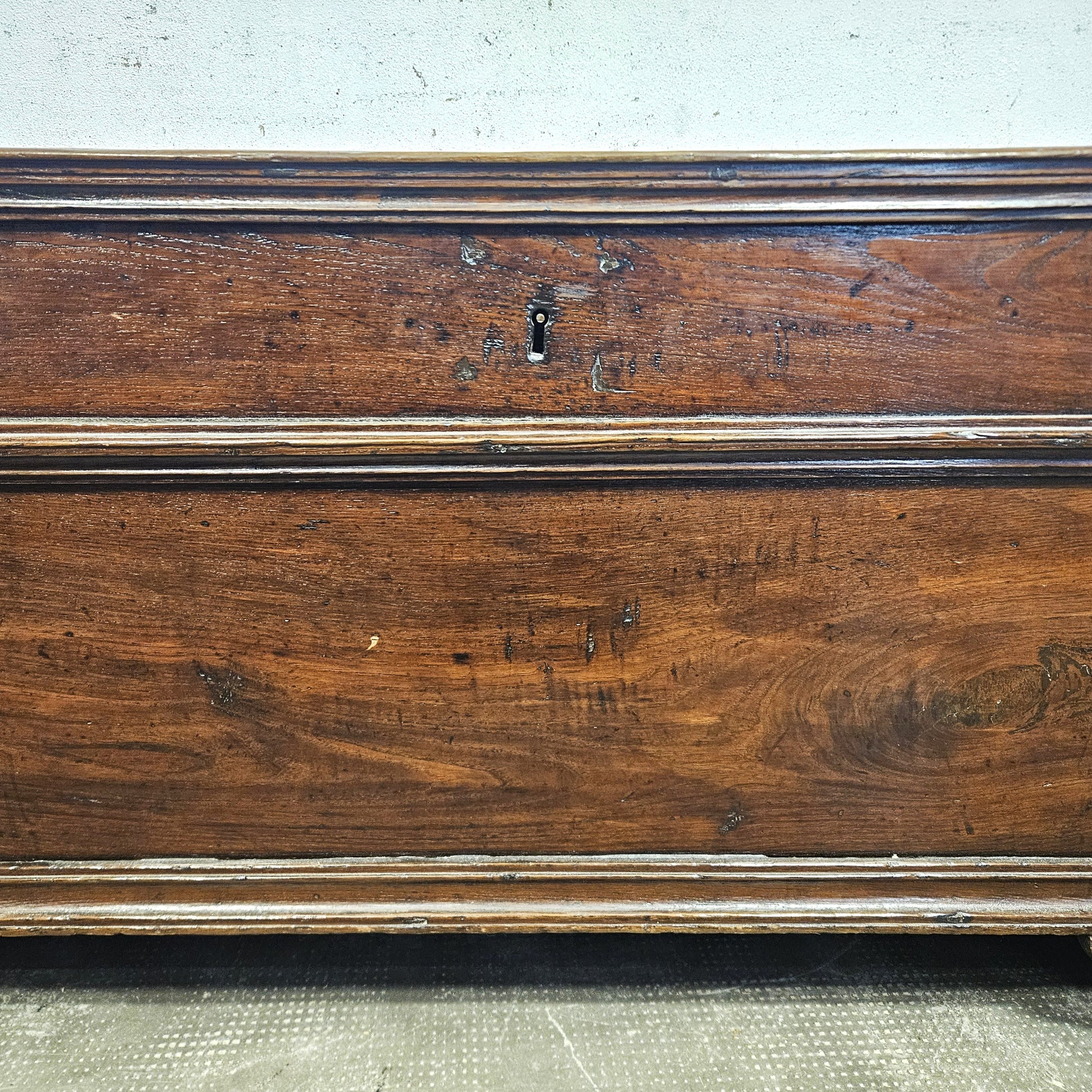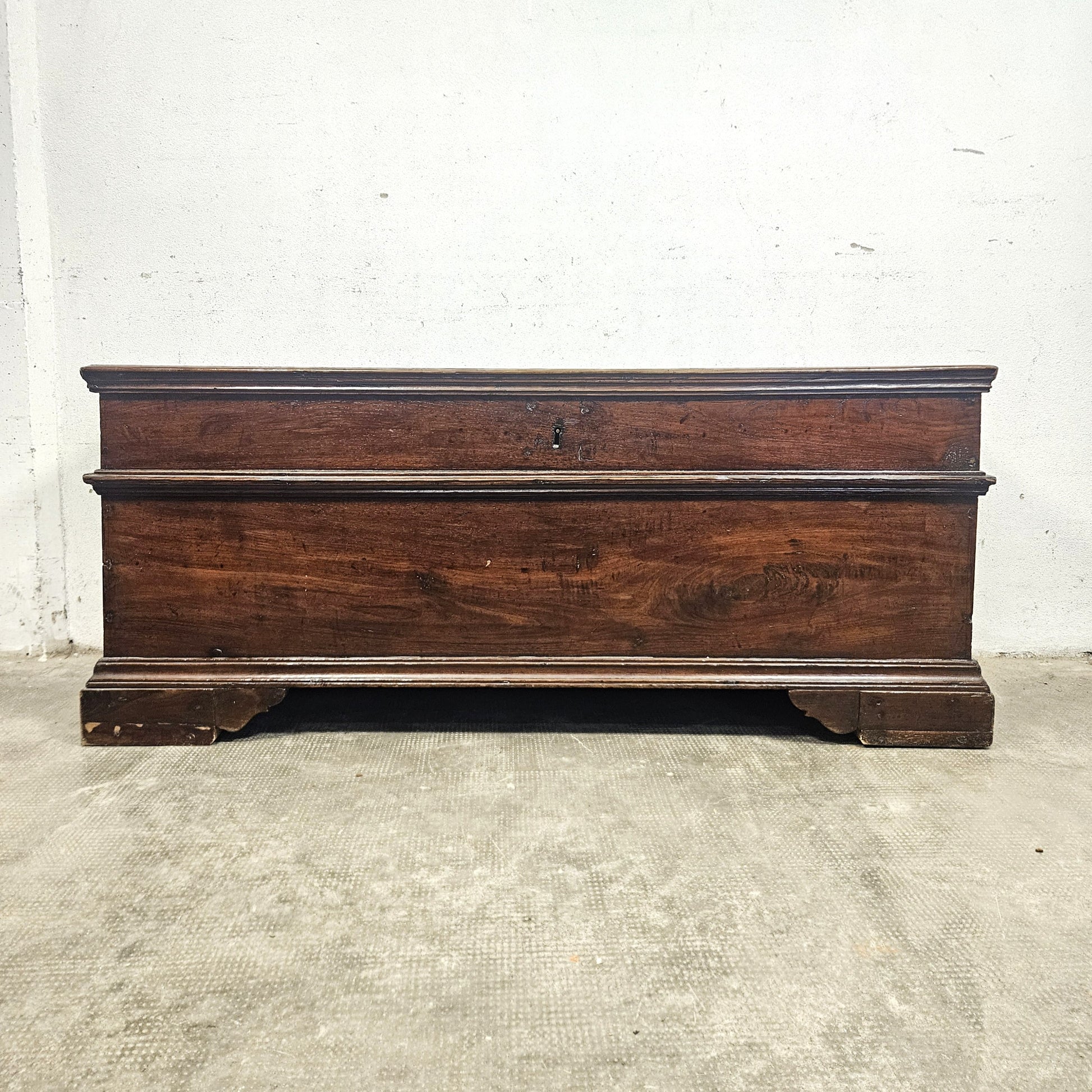Cassapanca dal design rurale, produzione di inizio '800. Il mobile è in legno massello di noce, poggia su quattro piedi a zoccolo. Il mobile conserva la sua integrità originale, inclusi i cardini e la serratura dell'epoca, mentre il piano superiore a ribalta rivela un ampio vano contenitore. Un pezzo di rara autenticità, perfetto per chi ricerca il fascino intramontabile dell'antiquariato rustico.