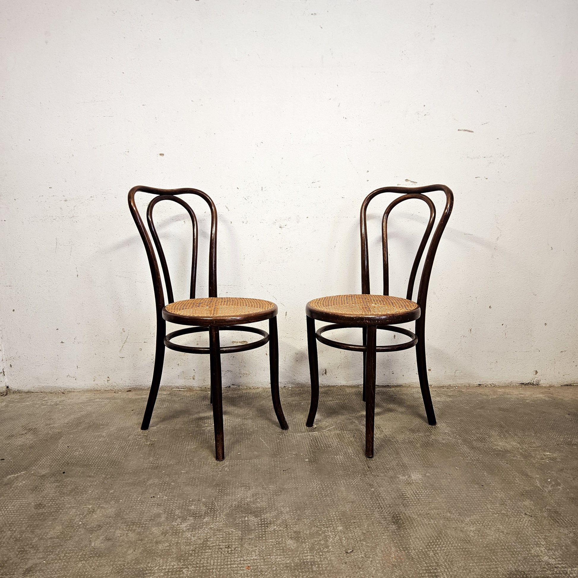 Coppia di sedie prodotte dall'azienda austro-boema D.G. Fischel Söhne negli anni '20. La struttura portante è in legno massello di faggio curvato a vapore, una tecnica che ne garantisce solidità e leggerezza visiva. Le superfici della seduta e dello schienale, in paglia di Vienna. Le sue dimensioni e la sua versatilità la rendono perfetta per essere utilizzata in sala da pranzo o in un bistrot, unendo la praticità di una seduta con l'estetica sofisticata di un pezzo di design.