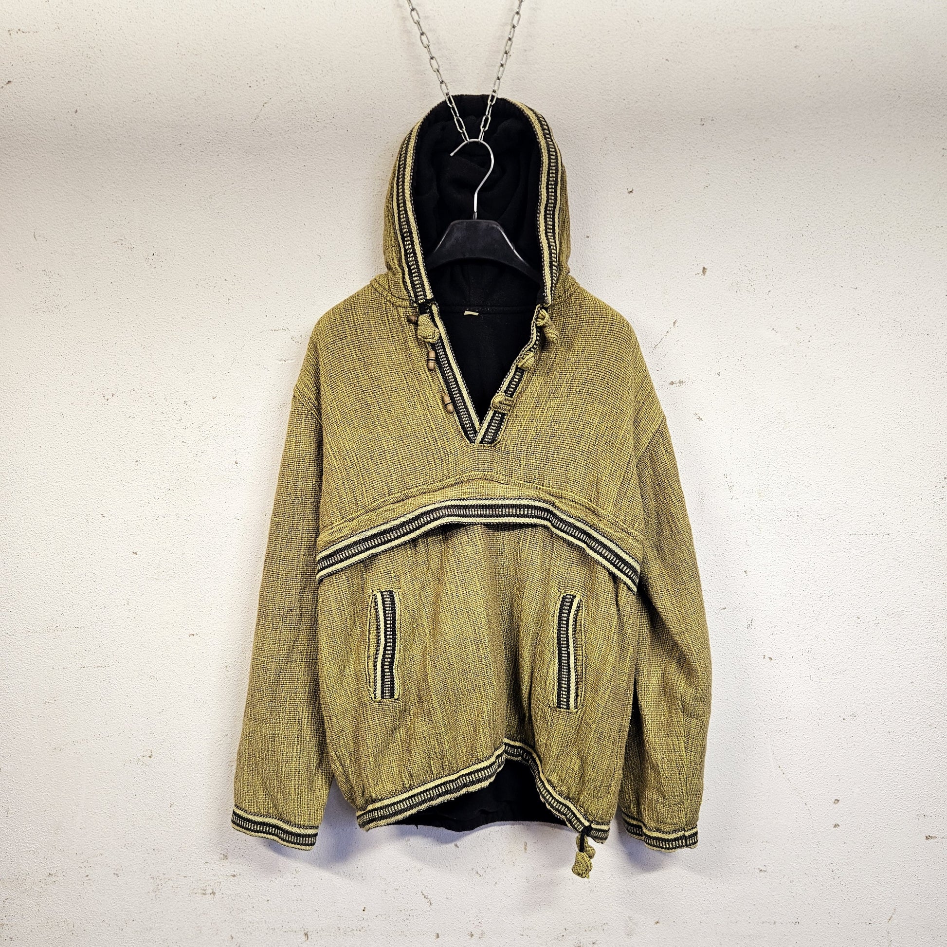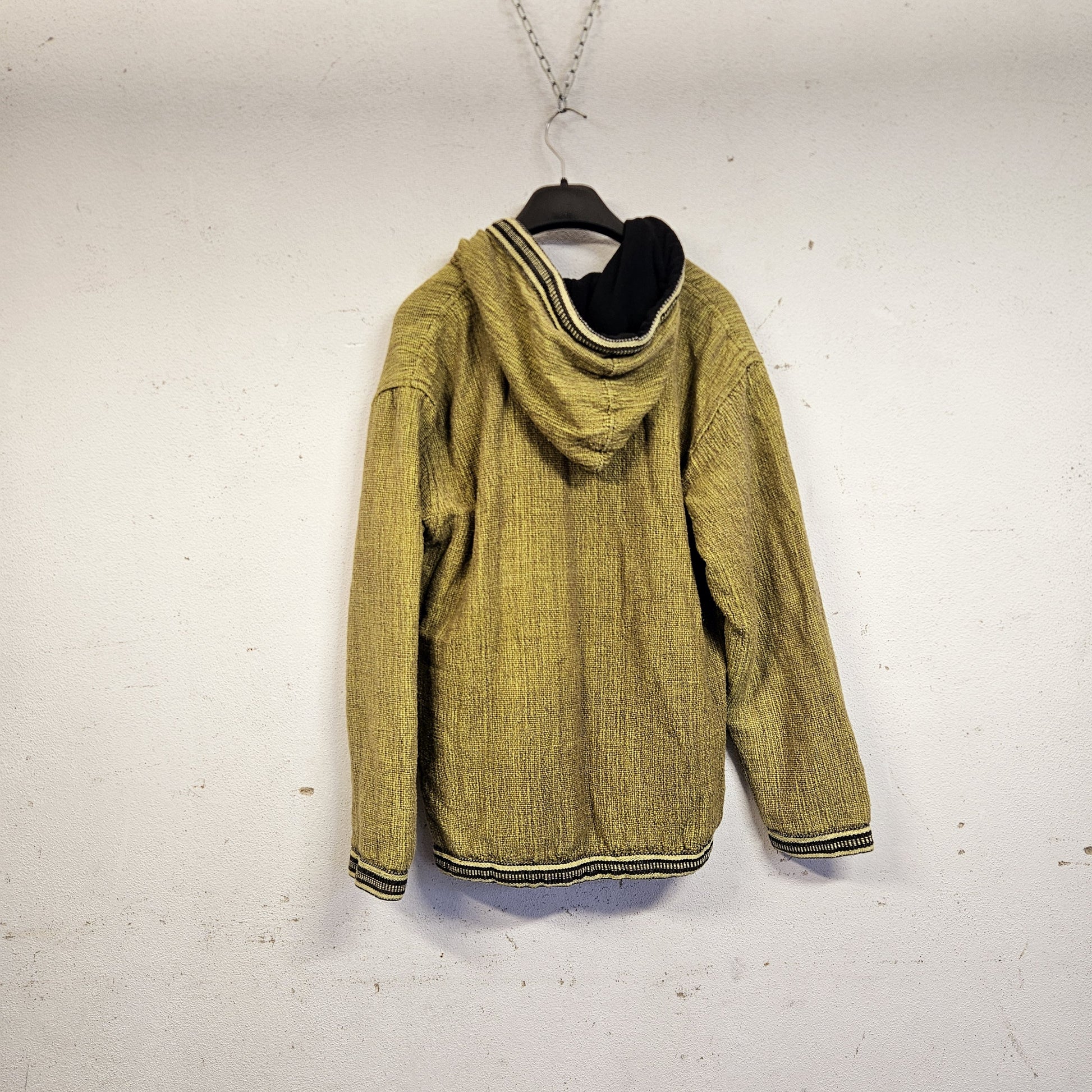 Felpa con cappuccio taglia M in misto cotone simil grezzo color verde oliva/senape, foderata in pile nero. La chiusura frontale sul petto è parziale, caratterizzata da una patta fermata da tre bottoni in legno. Un elemento decorativo distintivo è la banda che definisce il fondo, i polsini e il bordo della chiusura. La felpa è pratica, dotata di una piccola tasca a marsupio centrale e di due tasche laterali con chiusura a zip. Il taglio è ampio e confortevole, con una vestibilità indicativa taglia M. Questo capo è ideale per chi predilige un look etnico o hippie, perfetto per le mezze stagioni e per l'inverno in abbinamento a capi casual e streetwear.