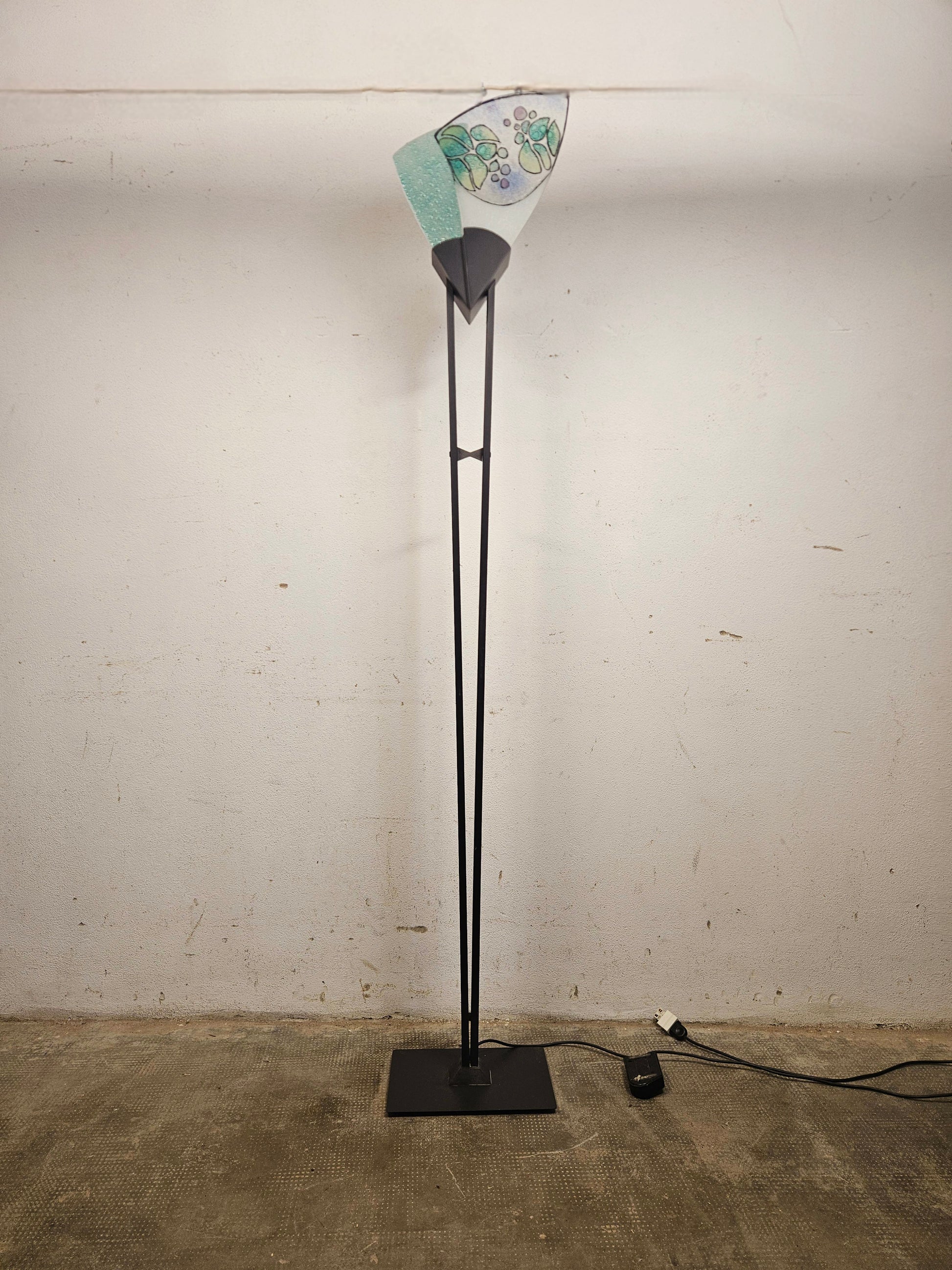 Lampada da terra con lampadina alogena ad intensità regolabile prodotta negli anni '80. La struttura portante è in metallo verniciato nero opaco, con una linea geometrica e slanciata. Il paralume, in vetro soffiato decorato, ha una forma conica rovesciata con una particolare fantasia che aggiunge profondità visiva e un tocco di colore. Le sue dimensioni importanti la rendono perfetta per essere utilizzata in un salotto o un angolo lettura, unendo la funzionalità di una fonte di luce a un pezzo di design.