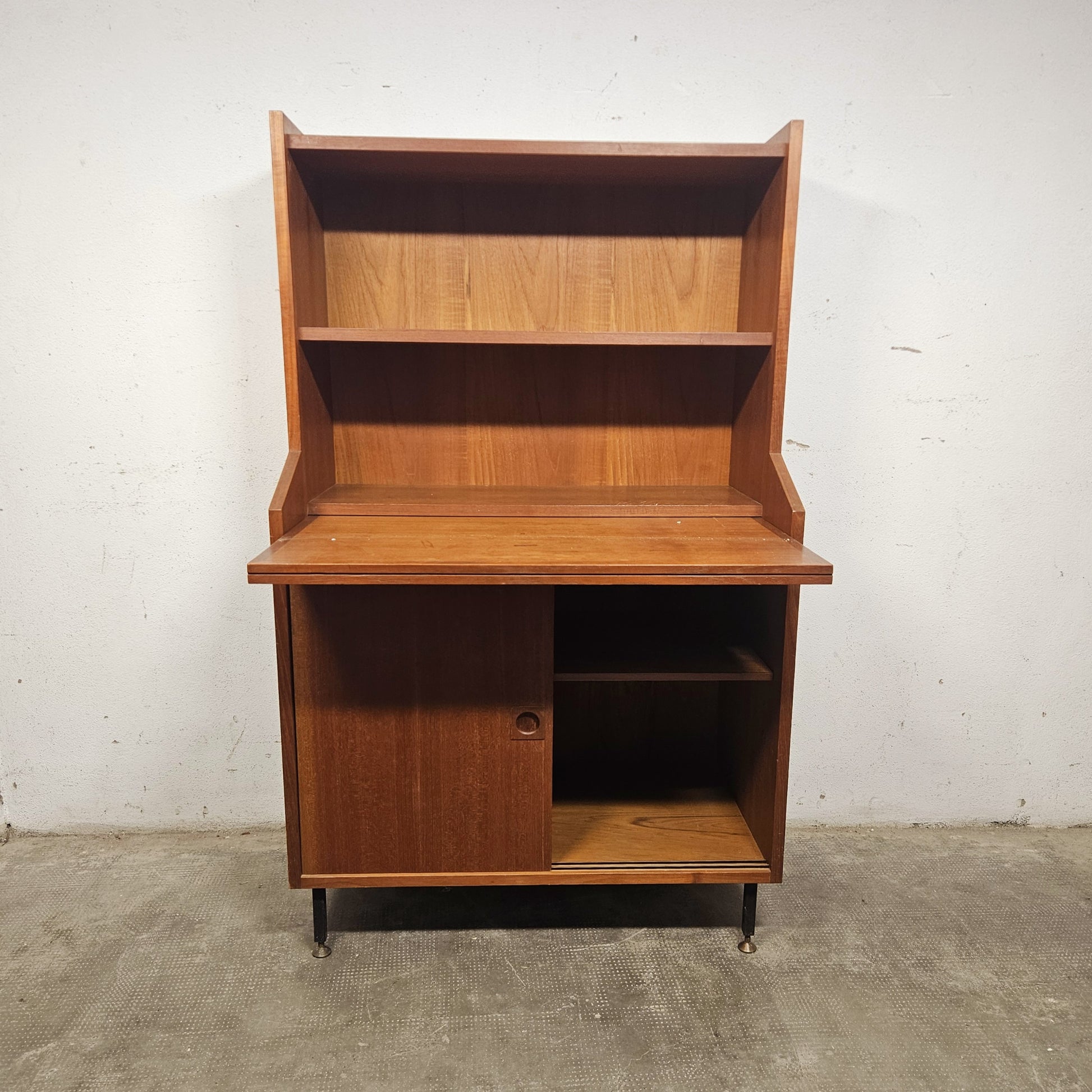 Libreria in teak risalente agli anni '50/'60. La struttura portante è interamente in legno di teak, con un design a due scomparti: una parte superiore a giorno con due ripiani e una parte inferiore con due porte scorrevoli dotate di maniglie rotonde intagliate. Il piano sopra la parte inferiore è estraibile rivelando un comodo appoggio pensato come scrivania. Il mobile poggia su esili gambe in metallo nero con punte in ottone, un dettaglio che ne esalta la leggerezza visiva. È un mobile versatile, ideale come libreria, mobile bar o per riporre oggetti in un ambiente moderno.