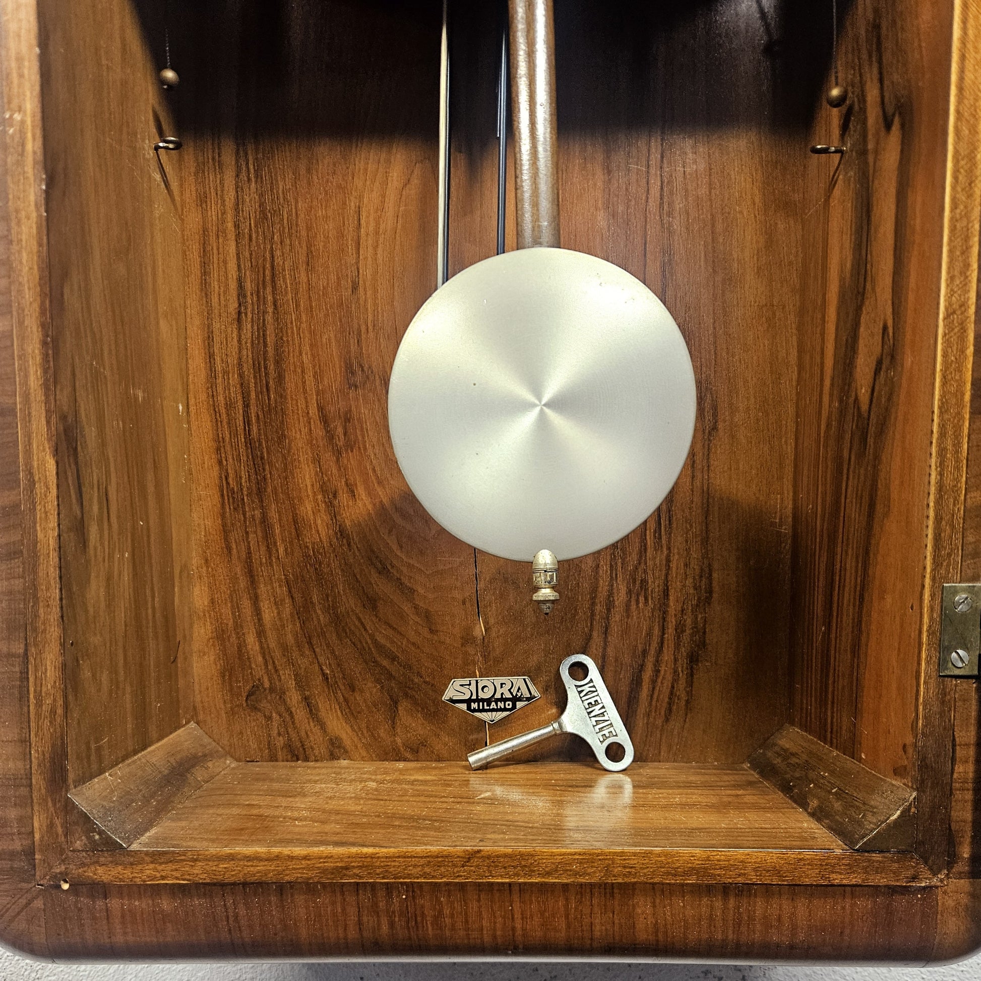 Orologio a pendolo da parete in stile Art Decò prodotto dalla ditta milanese Siora negli anni '30. La cassa è realizzata in legno impiallacciato con una ricca venatura scura. Si distingue per la sua forma rettangolare con i lati dolcemente arrotondati. Il quadrante presenta un design geometrico e minimalista, con numeri in ottone su uno sfondo scuro, in legno laccato. Sotto, il vano in vetro espone il pendolo circolare in metallo satinato.