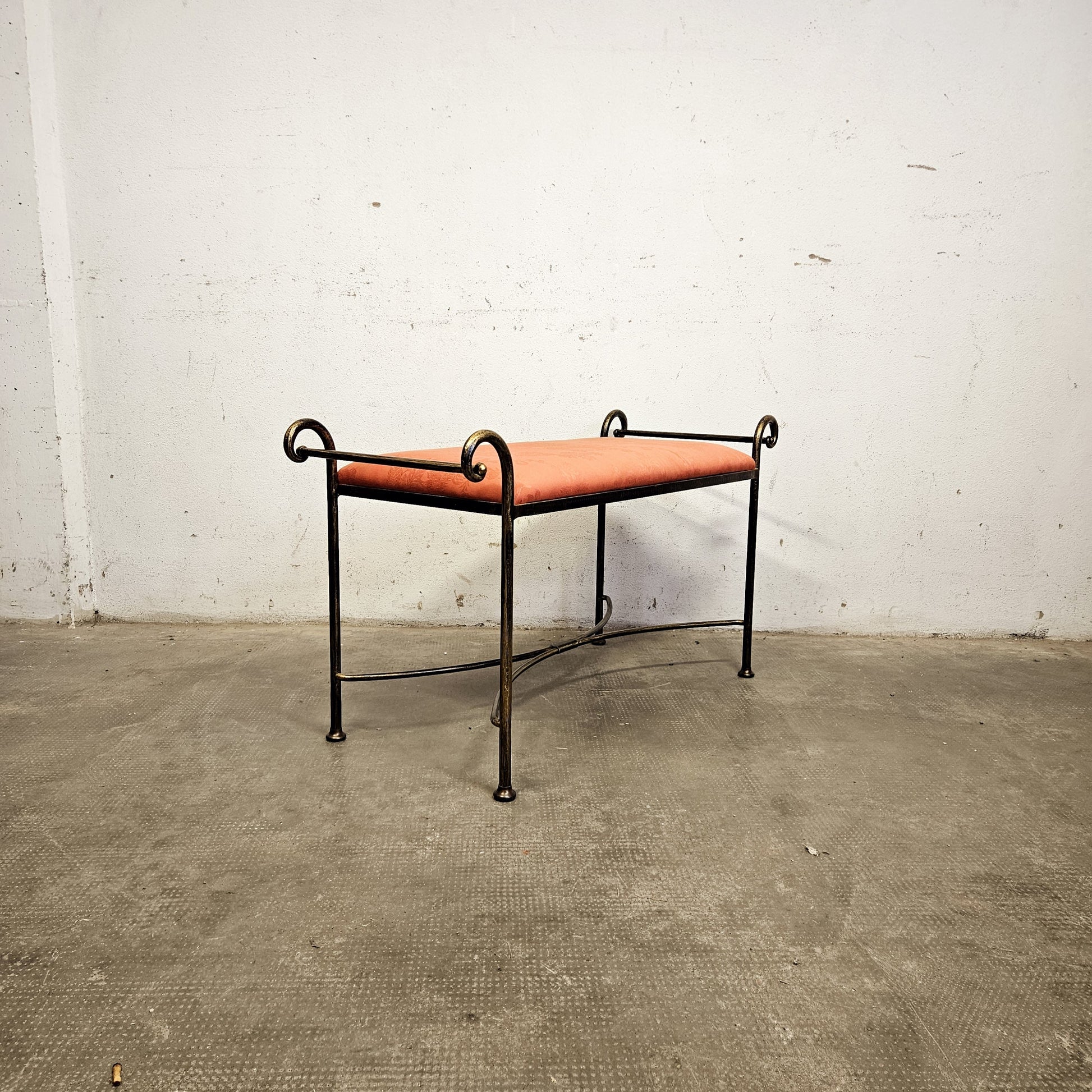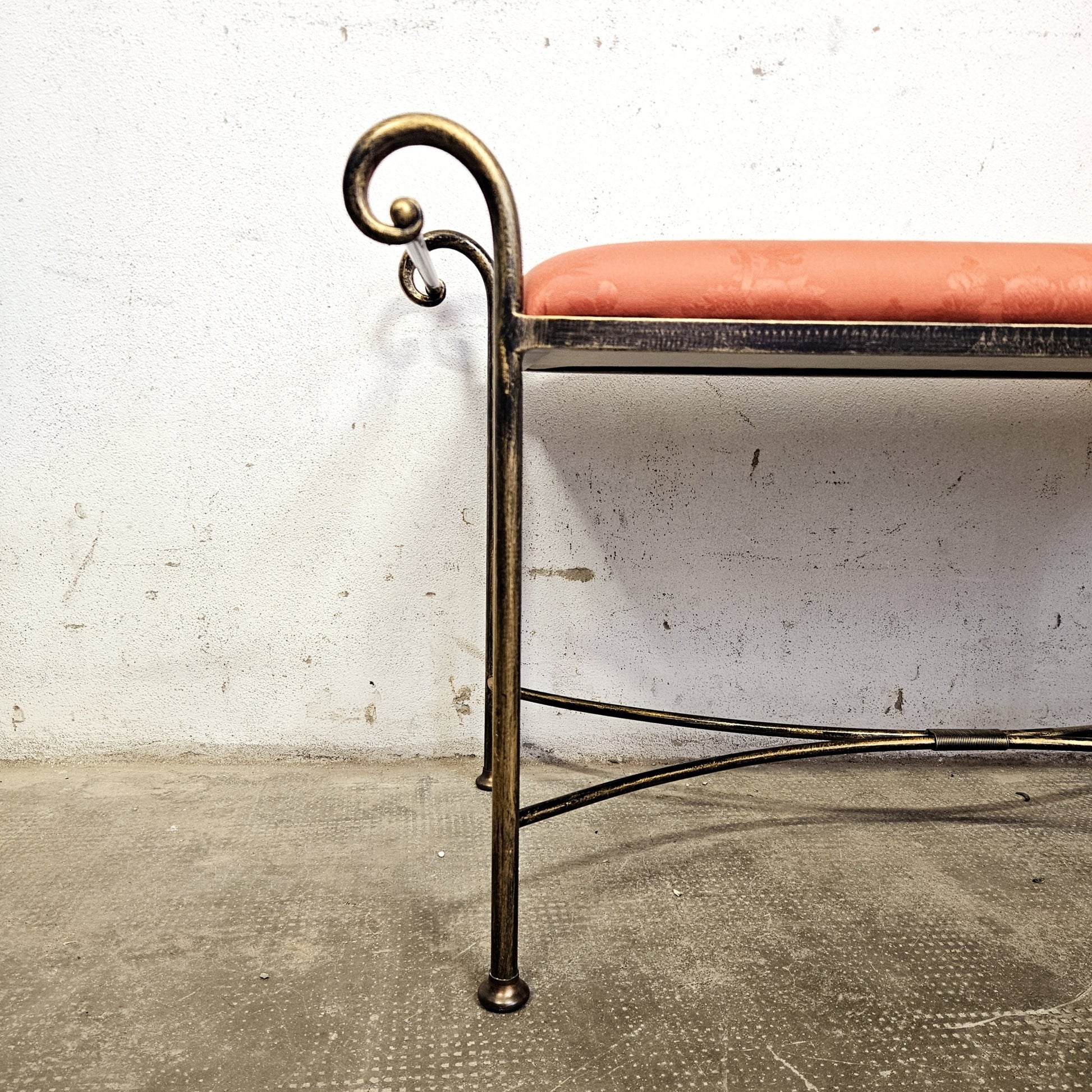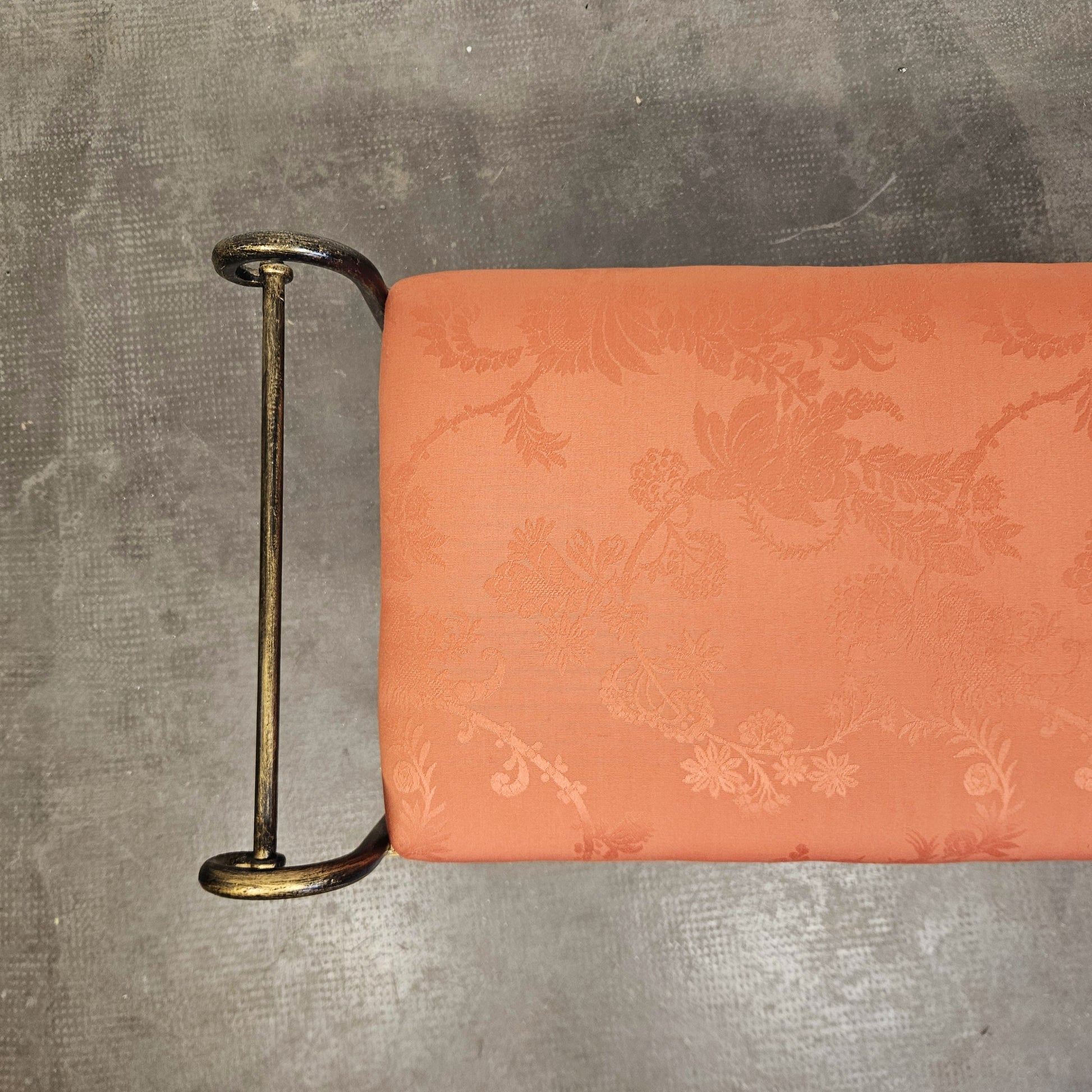 Panca in ferro battuto con cuscino in stile neoclassico, produzione di inizio '900. Presenta una struttura leggera e decorativa in ferro battuto con finitura scura patinata, probabilmente ottone. Il design si ispira a linee Neoclassiche e Romantiche, caratterizzato da gambe sottili unite da una traversa centrale a 'X'. Gli elementi decorativi più distintivi sono i braccioli laterali arrotolati a ricciolo. La seduta è imbottita con un cuscino rivestito in tessuto arancione/corallo con un motivo damascato floreale in rilievo.