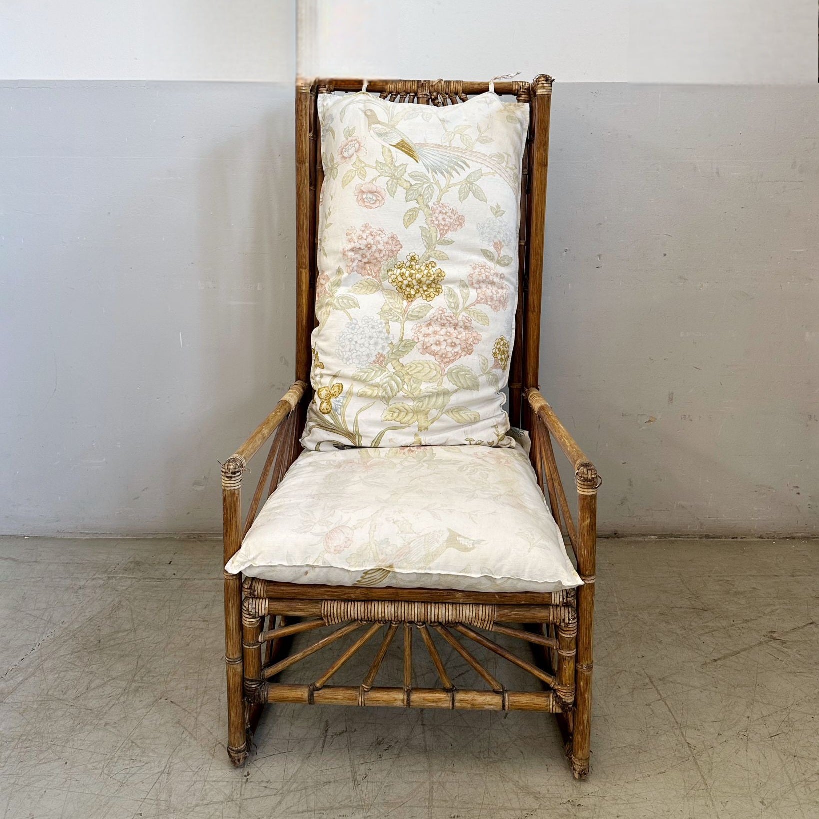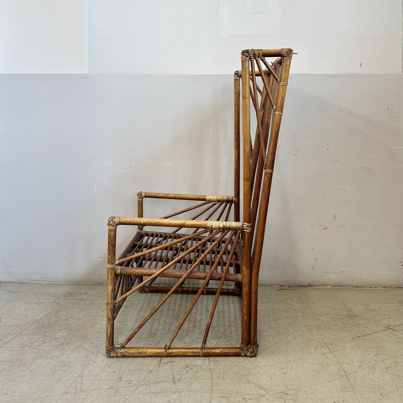 Poltrona in bambù e rattan, produzione e design tipici degli anni '70. La robusta struttura è abilmente realizzata in bambù e rattan intrecciato, con linee pulite e geometriche. La seduta e lo schienale, quest'ultimo particolarmente elevato e accogliente, sono composti da canne di bambù e midollino disposti con un'intrigante trama a raggiera, che conferisce un notevole impatto visivo e un tocco decorativo. Le sue dimensioni generose la rendono un elemento d'arredo versatile, ideale per arricchire sia ambienti interni che esterni, fondendo la funzionalità di una seduta confortevole con l'estetica ricercata di un oggetto di design.