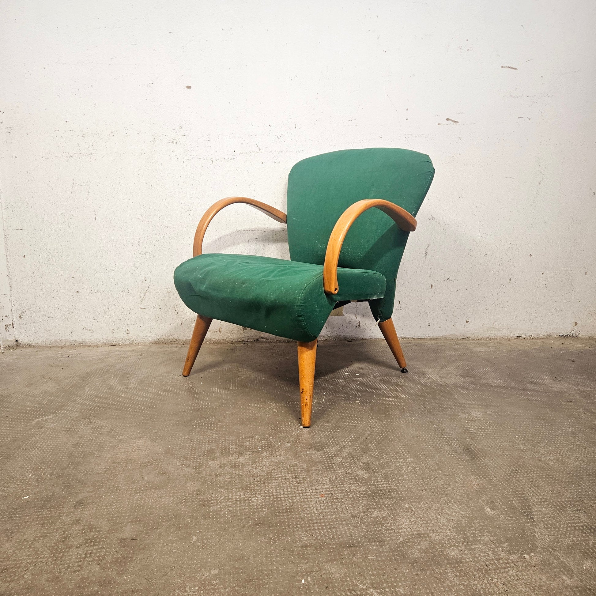 Poltrona di fabbricazione recente che riprende lo stile e le linee tipiche del design anni '50/'60. La struttura è in legno chiaro, con quattro piedini torniti a "spillo" e sorregge una seduta avvolgente e un schienale imbottiti e rivestiti da un tessuto vellutato verde smeraldo. Ai lati si trovano dei braccioli curvi che definiscono una linea che ricorda il design di metà secolo scorso. Il design compatto e l'ingombro ridotto lo rendono ideale per soggiorni, angoli lettura o camere da letto o come poltrona d'accento in spazi ristretti.