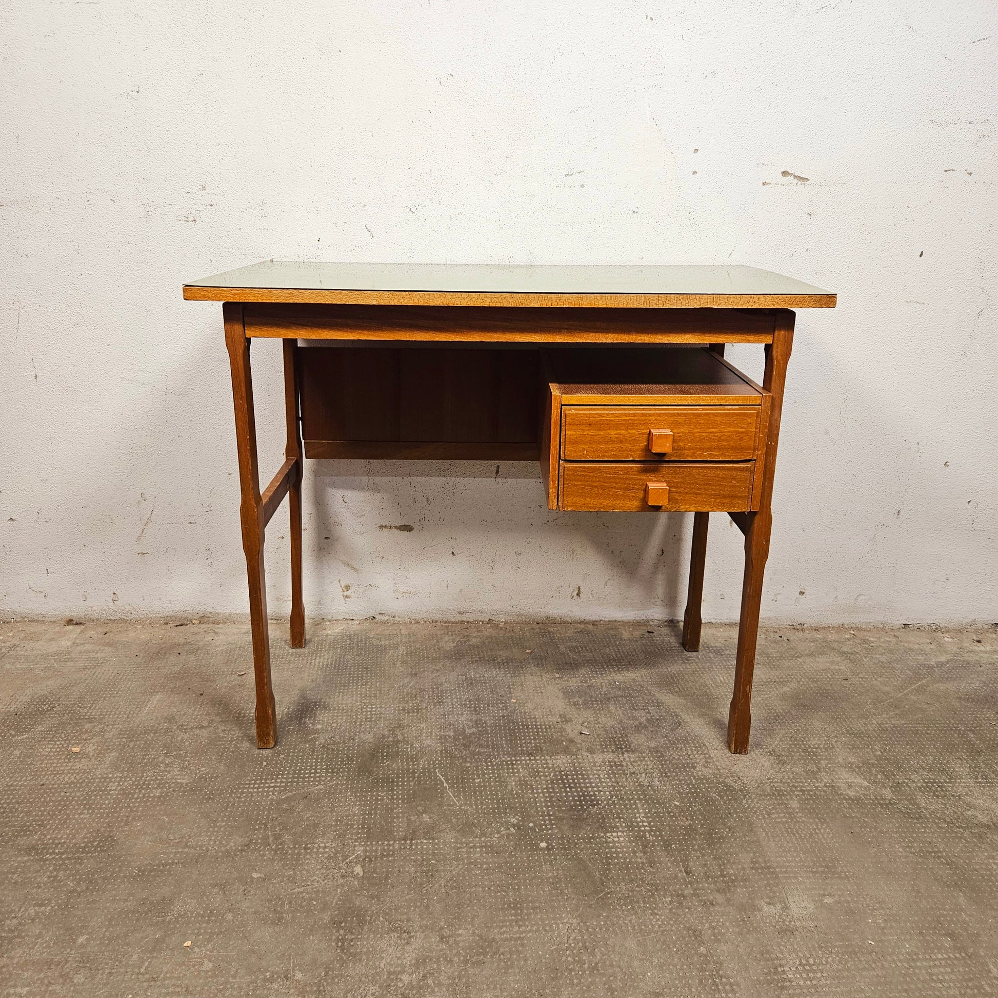 Scrivania in legno con piano verde e doppio cassetto laterale prodotta dalla ditta Dal Vera negli anni '50. La struttura portante e i cassetti sono in legno impiallacciato con una finitura calda che ne assicura la stabilità e mette in risalto le venature del legno. Il piano d'appoggio, spazioso e rettangolare, è rifinito con un laminato di un elegante colore verde salvia, crea un piacevole contrasto con il calore del legno. I cassetti sono dotati di maniglie in legno che mantengono le linee pulite e minimaliste del design.