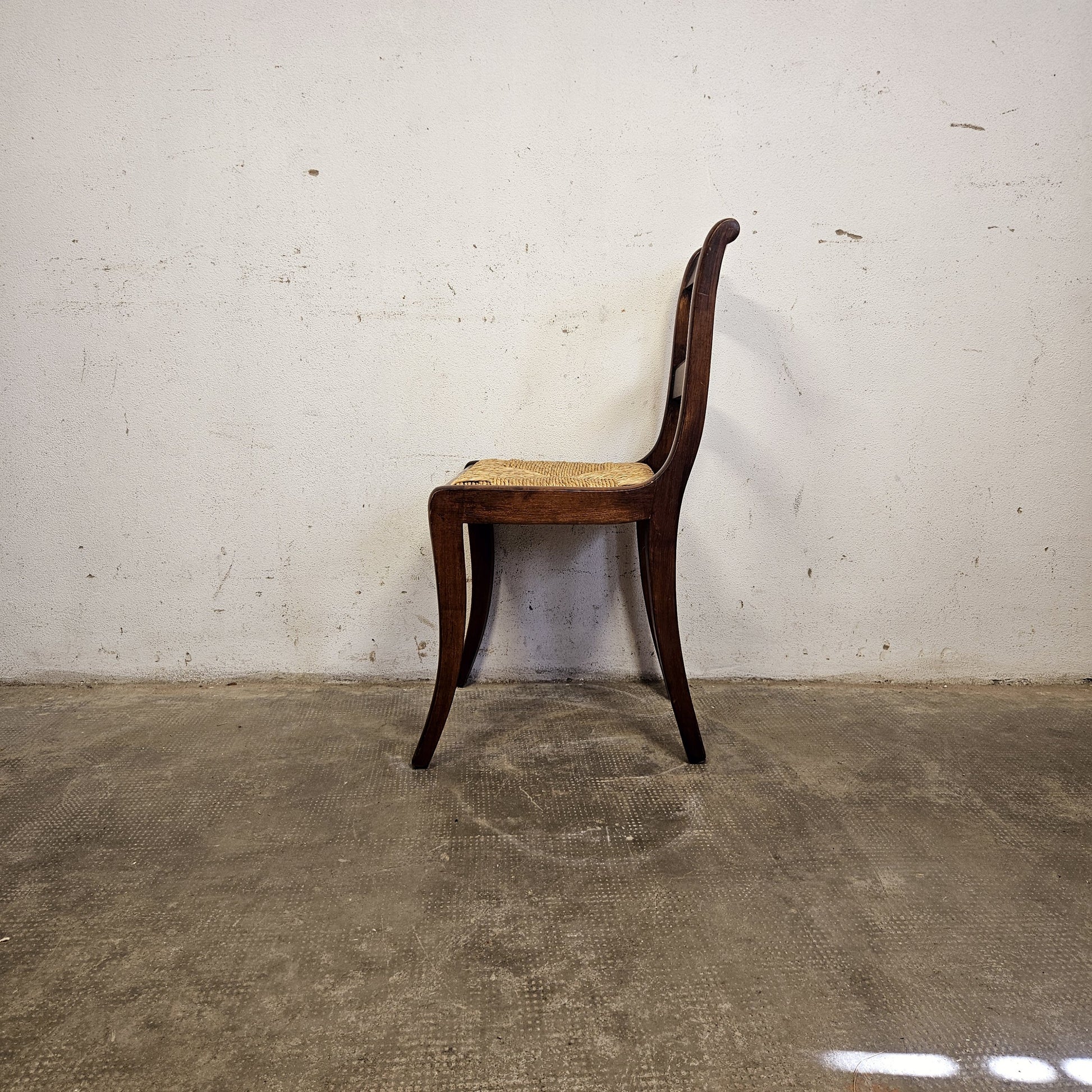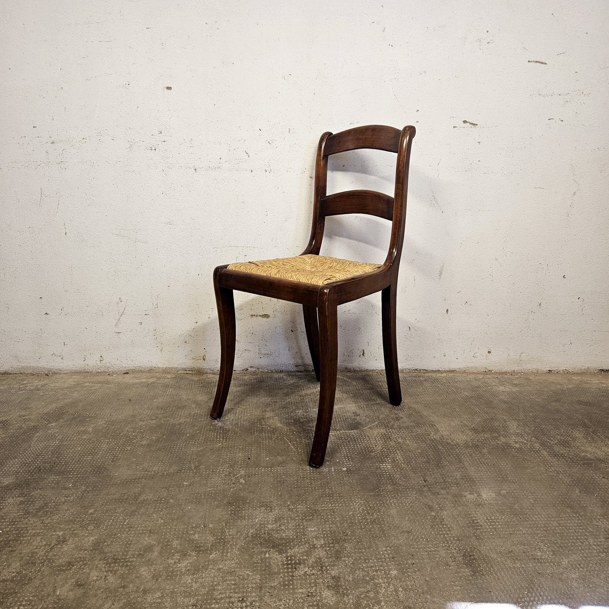 Sedia in stile rustico, prodotta a inizio XX secolo. La struttura portante è in legno massello scuro, con le gambe a sciabola che ne definiscono l'estetica. Lo schienale curvo e la seduta in paglia intrecciata la rendono un pezzo leggero e funzionale. È un elemento d'arredo versatile, ideale per un salotto o una sala da pranzo, che unisce la semplicità delle forme con il calore dei materiali naturali.