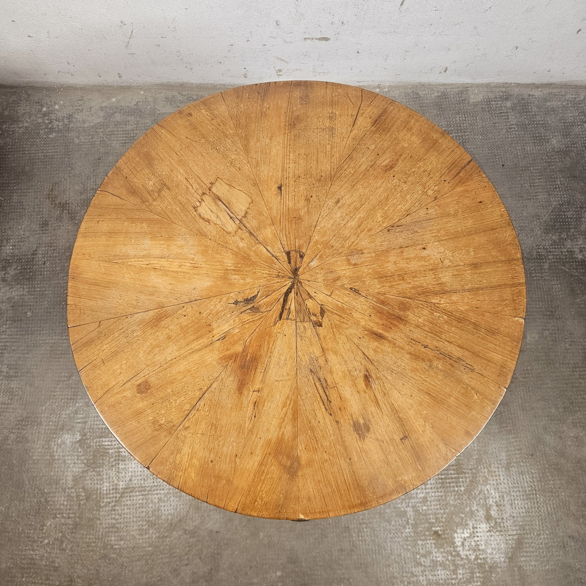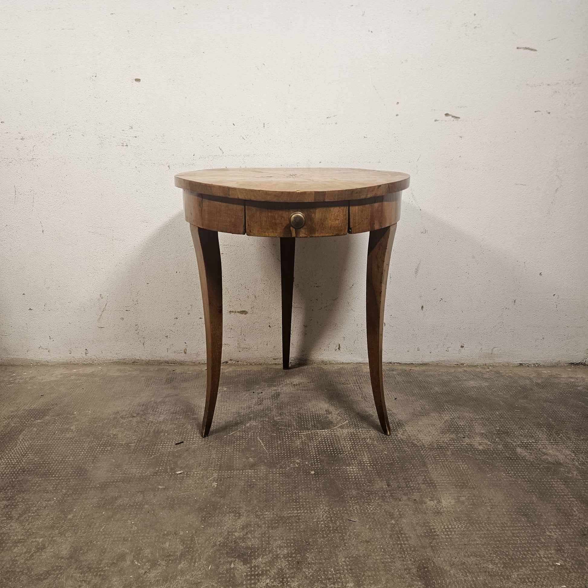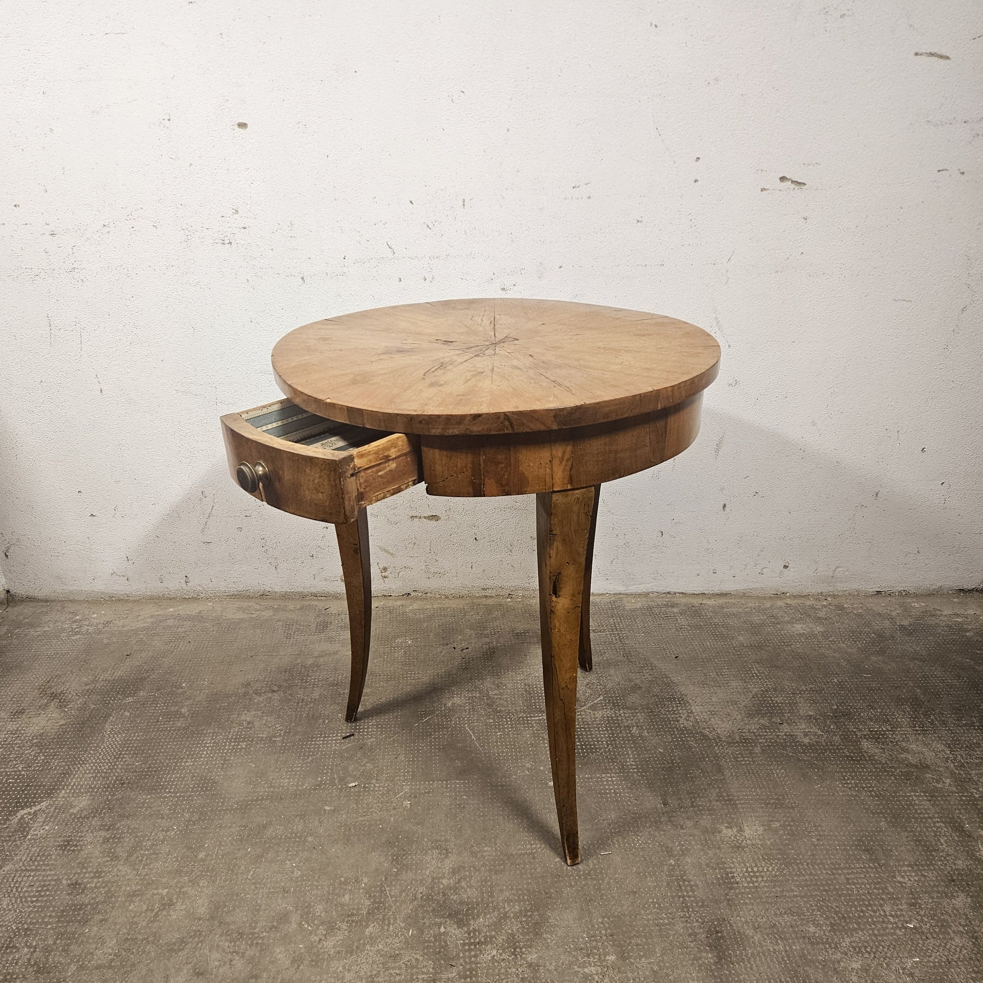 Tavolo rotondo in noce prodotto alla fine del XIX secolo. Il pezzo è realizzato in legno di noce, con una ricca venatura. Il piano circolare è l'elemento focale, caratterizzato da un raffinato intarsio a raggiera che converge al centro, enfatizzando il movimento del legno. Il tavolino presenta anche un cassetto a scomparsa, con pomello in ottone, integrato nel fascione perimetrale del piano. La struttura e le gambe a sciabola curve e affusolate richiamano lo stile Neoclassico o Impero.