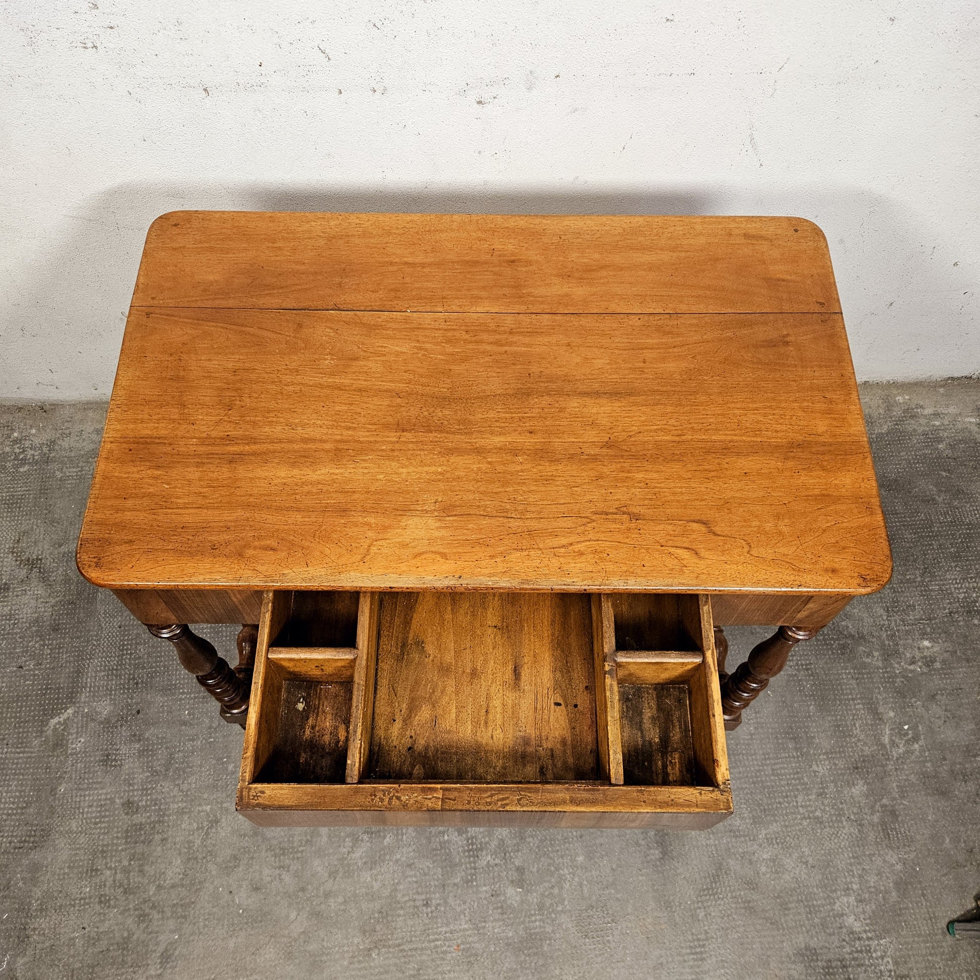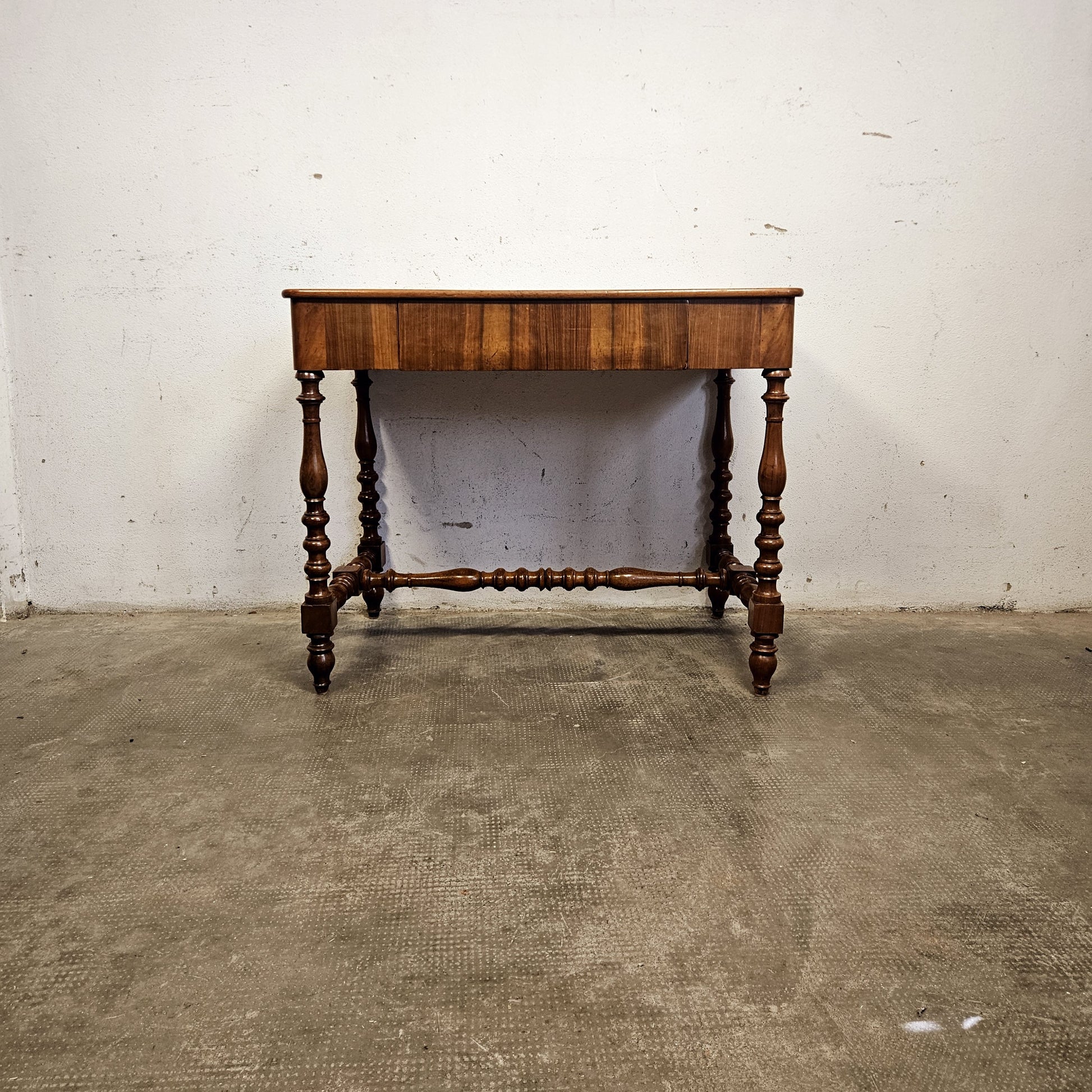 Tavolo a rocchetto in stile barocco prodotto presumibilmente all'inizio del '900 in Emilia-Romagna. La struttura portante è in essenza di noce con nobilitazione in lastronato di noce. Presenta quattro eleganti gambe a fuso e una traversa inferiore a crociera. Il piano superiore ospita un ampio cassetto con dei divisori interni, aumentando la praticità del mobile. Le sue dimensioni e la sua versatilità lo rendono ideale sia come scrivania che come tavolo consolle, unendo la funzionalità con l'estetica di un pezzo classico.