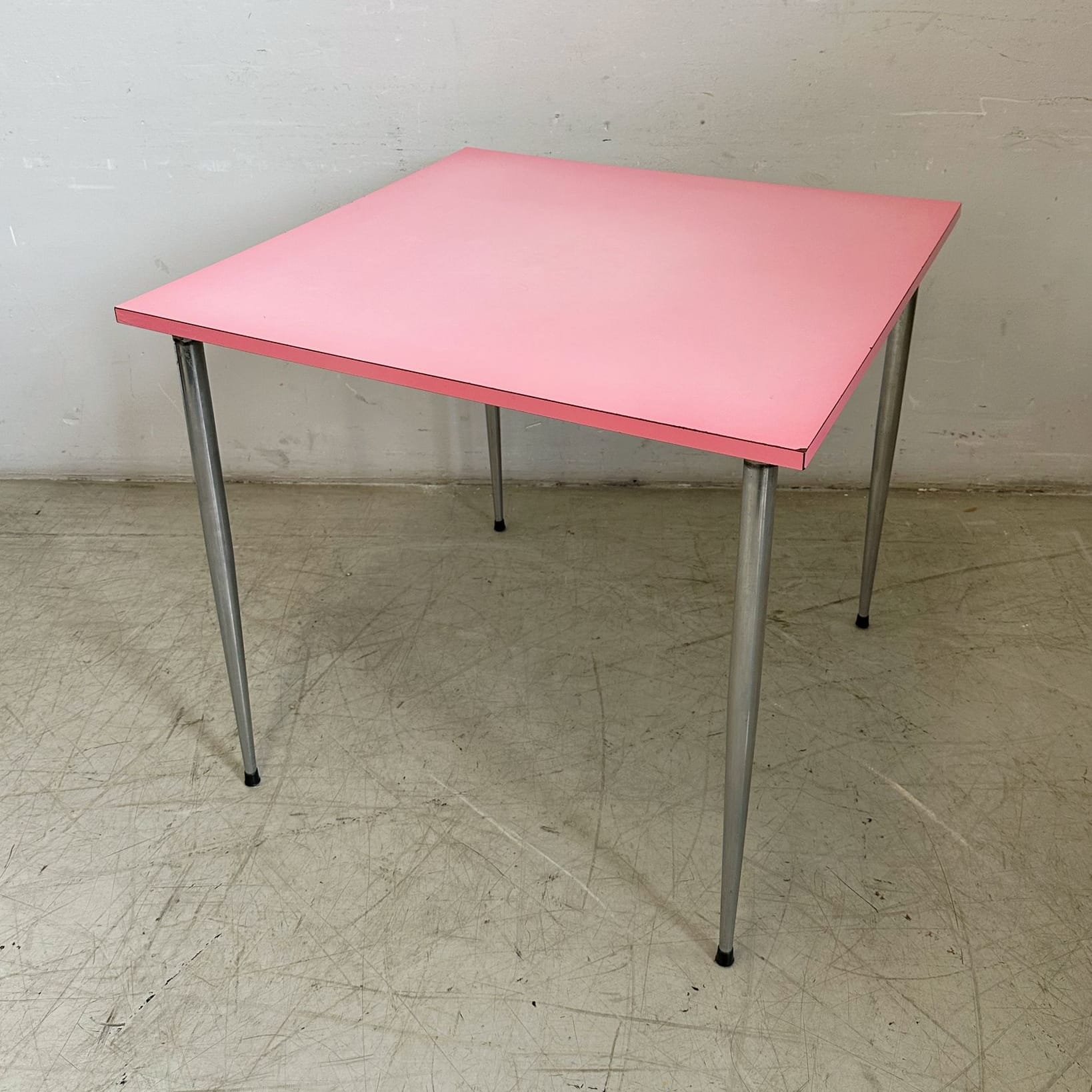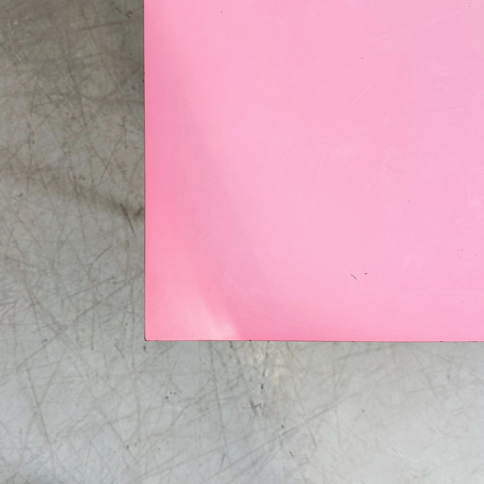 Tavolo da cucina o bar con piano in formica rosa, design funzionalista anni '80/'90. La struttura poggia su quattro gambe in metallo tubolare cromato dal design lineare e minimalista, che garantiscono stabilità e leggerezza visiva. Il piano d'appoggio, sottile e leggero, è rifinito con un laminato rosa acceso che crea un'estetica pop e distintiva. Le sue dimensioni compatte e il suo design versatile lo rendono perfetto come tavolino da pranzo o come tavolo per un locale dall'ambiente creativo.